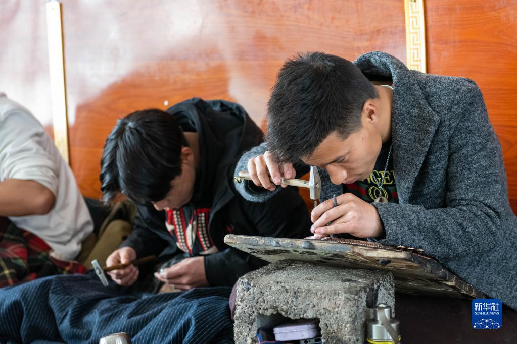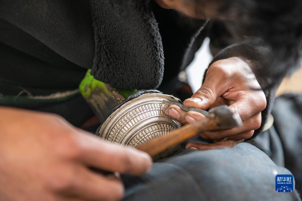 昌都市察雅縣的手工藝人在加工金銀器(4月8日攝)。新華社記者 王澤昊 攝