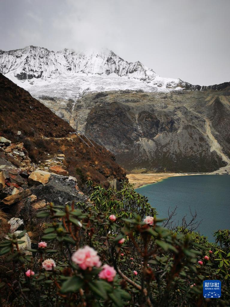 這是4月30日拍攝的高山杜鵑和白瑪林措、庫拉崗日雪山。新華社記者 沈虹冰 攝