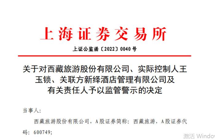 據(jù)上交所7日消息,因涉及非經(jīng)營性資金占用,且相關(guān)信息披露不真實(shí)、不準(zhǔn)確等,上交所決定對(duì)西藏旅游股份有限公司、實(shí)際控制人王玉鎖、關(guān)聯(lián)方新繹酒店管理有限公司及有關(guān)責(zé)任人予以監(jiān)管警示。