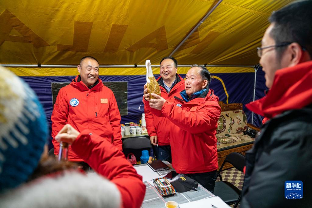 浮空艇創(chuàng)造紀(jì)錄后,科考隊員開香檳慶祝(5月15日 攝)。新華社記者 孫非 攝