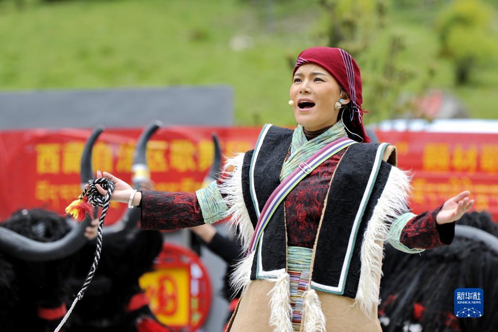 5月31日,演員在隆子縣玉麥鄉(xiāng)文化廣場表演歌舞劇《天邊格?;ā?。新華社記者 劉洲鵬 攝