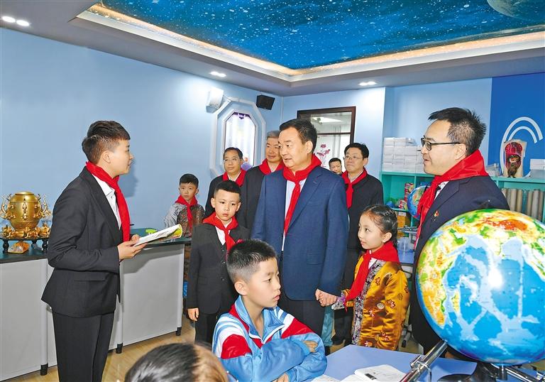 拉薩市第一小學正在開展的“鑄牢中華民族共同體意識”少先隊活動課豐富多彩。音樂室里孩子們演奏的六弦琴韻律歡快,王君正駐足傾聽,夸贊孩子們多才多藝;科技工作室里老師正引導孩子們做科學實驗,王君正認真觀看,勉勵孩子們從小樹立科學觀念,講科學、愛科學、學科學、用科學,永葆求知探索之心;走進美術室,看到孩子們埋頭練習,王君正關切地詢問:“現(xiàn)在孩子們近視的多嗎?”叮囑說,要注意保護孩子們的視力,呵護好他們的身心健康。