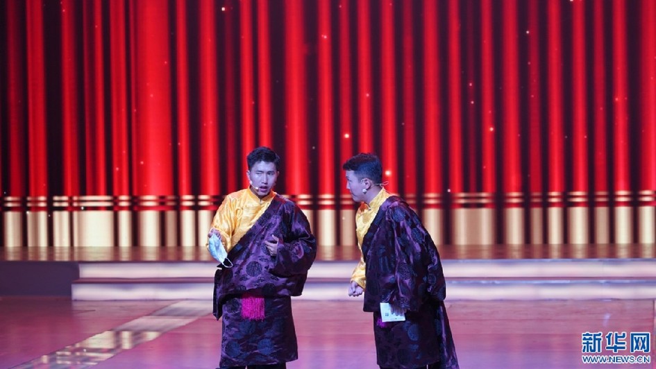 圖為晚會現(xiàn)場相聲表演《防疫從我做起》(5月31日攝)。新華網(wǎng)發(fā) 貢桑央吉(實習生)攝