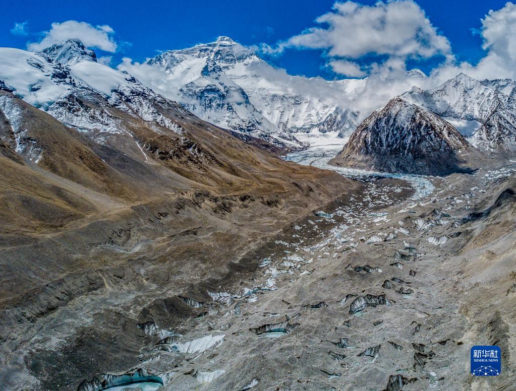 這是5月8日在西藏日喀則市拍攝的珠穆朗瑪峰腳下的絨布冰川(無(wú)人機(jī)照片)。新華社記者 田金文 攝