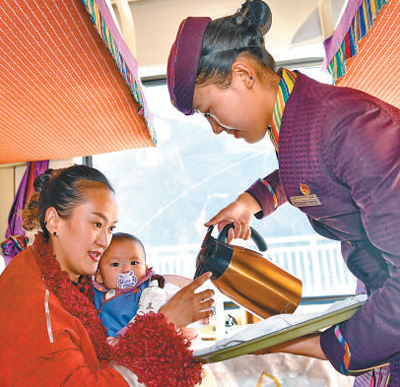 青藏鐵路延長線拉日鐵路Z8801次列車上,乘務(wù)員在為乘客倒水。新華社記者 張汝鋒攝