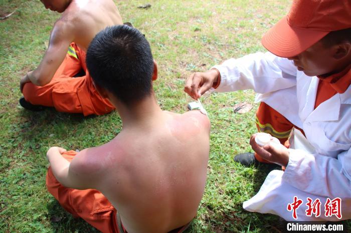 圖為為曬傷的隊(duì)員及時(shí)救治。 林芝市森林消防支隊(duì)供圖