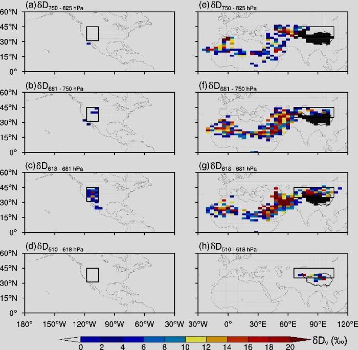 目前,不同地表介質中穩(wěn)定同位素出現“反高程效應”的原因仍然不明。對此,中外合作研究團隊發(fā)現,在美國西部和亞洲干旱區(qū)(從紅海到青藏高原北部)等地區(qū)對流層中層的水汽穩(wěn)定同位素也類似存在“反高程效應”,而且其空間分布格局與地表介質中穩(wěn)定同位素“反高程效應”的空間分布格局基本一致。
