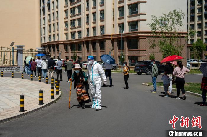 圖為8月12日,拉薩一小區(qū)內(nèi),工作人員攙扶藏族老人進(jìn)行核酸檢測。 江飛波 攝