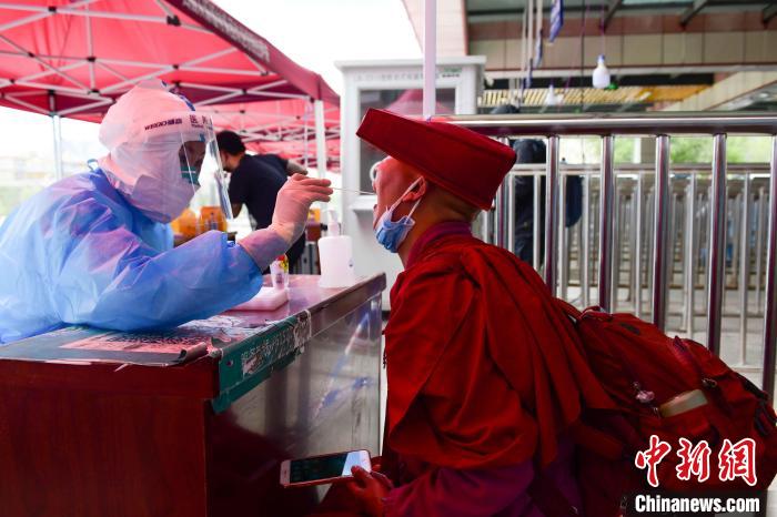 圖為8月11日,一位僧人在火車站出口處做核酸?!∝暩聛硭?攝