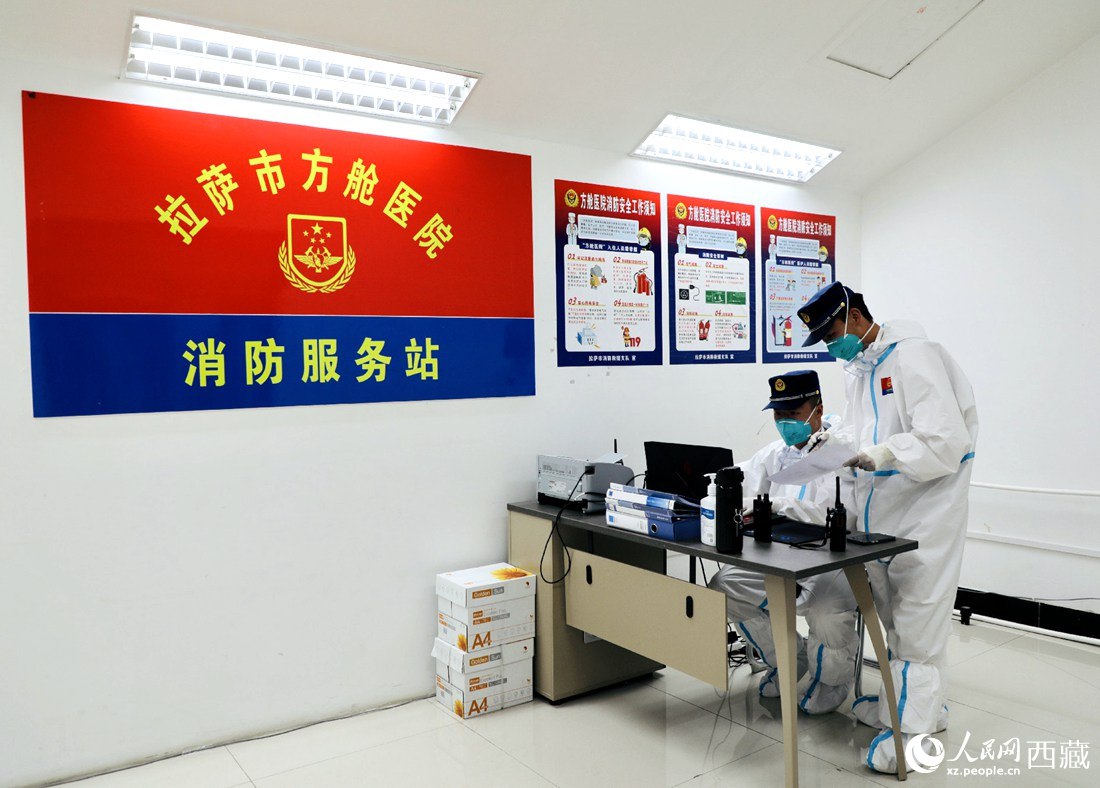 方艙醫(yī)院消防服務(wù)站中消防人員在工作。人民網(wǎng) 次仁羅布 攝