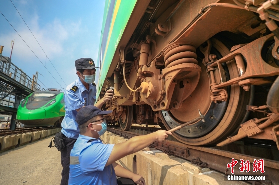 8月17日,北京車輛段北京西庫檢車間內(nèi),檢修人員對時(shí)速160公里動(dòng)力集中型復(fù)興號動(dòng)車組(俗稱“綠巨人”)的走行部進(jìn)行檢修。這里是京津冀地區(qū)唯一的“綠巨人”檢修維修基地,肩負(fù)著18列共計(jì)261節(jié)車輛的檢修任務(wù)。隨著暑運(yùn)逐漸迎來返校返程高峰,檢修人員也在加班加點(diǎn)為列車做好體檢工作,確保運(yùn)行安全。 中新社記者 賈天勇 攝