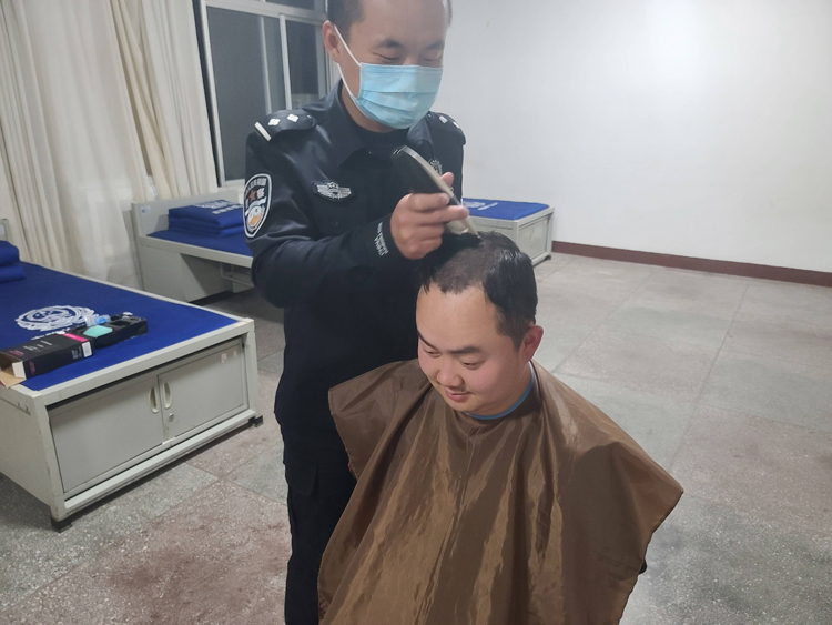 在隔離酒店執(zhí)勤的副所長王士博,在完成工作后請(qǐng)同事幫忙給自己剃了個(gè)光頭,“當(dāng)前疫情防控形勢(shì)嚴(yán)峻,天氣逐漸變暖,每天穿著防護(hù)服工作,一身都是汗?!蓖跏坎┱f,剃掉頭發(fā)后更加涼快,在節(jié)省時(shí)間的同時(shí)也能避免頭發(fā)沾染病毒,更加安全。
