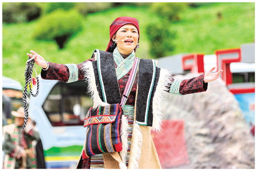 5月31日,演員在隆子縣玉麥鄉(xiāng)文化廣場表演歌舞劇《天邊格?;ā?。 新華社記者張汝鋒攝