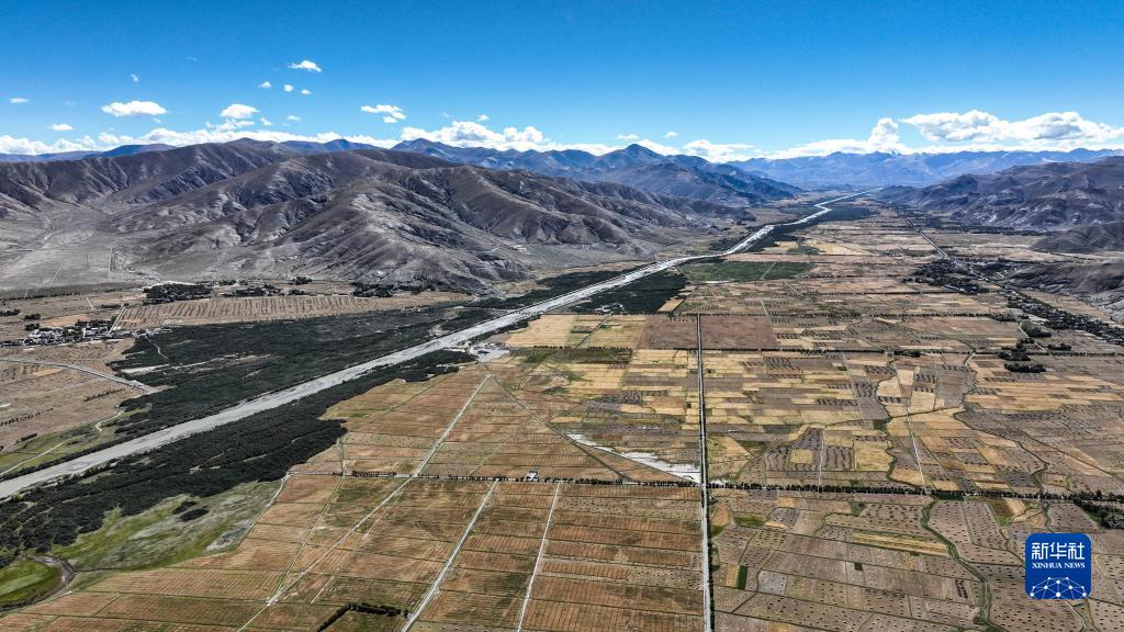 西藏日喀則江孜段富饒的農(nóng)田(9月19日攝,無人機(jī)照片)。新華社記者 晉美多吉 攝