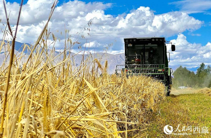 農(nóng)戶使用收割機收青稞。次仁羅布 攝