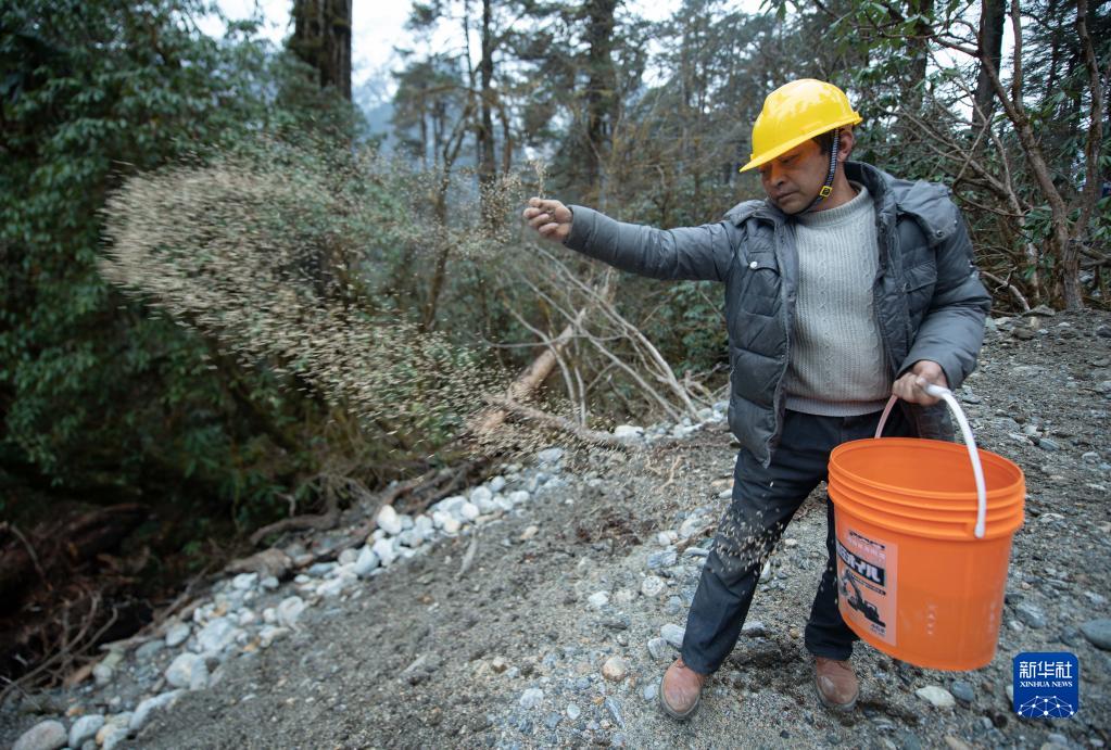 工人在派墨公路沿線撒播植物種子(2021年3月11日攝)。新華社發(fā)(董志雄 攝)