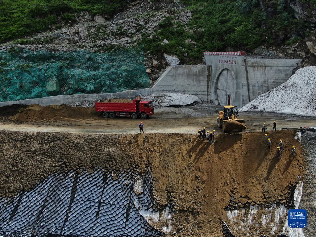 工人在派墨公路多雄拉隧道出口段土工格室高寒邊坡綠化實驗項目現(xiàn)場施工(2020年8月18日攝,無人機照片)。新華社發(fā)(董志雄 攝)