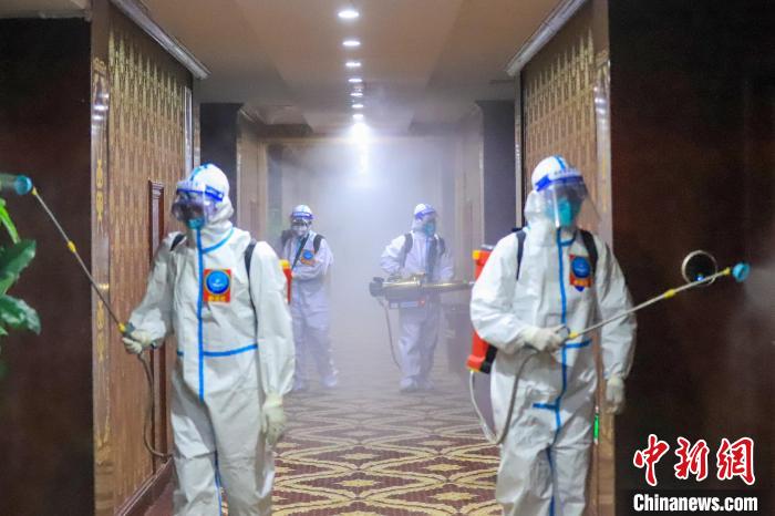 西藏森林消防隊員對隔離酒店進(jìn)行覆蓋式消殺?!∥鞑厣窒揽傟?供圖