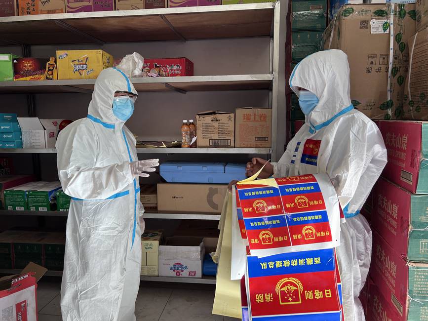 圖為日喀則支隊(duì)后勤管理員李萬(wàn)樂(lè)(右一)與醫(yī)療、生活物資保供單位聯(lián)系,調(diào)集防疫物資。