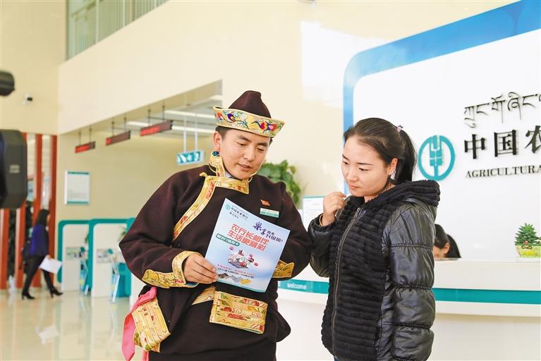 農(nóng)行西藏分行員工輔導客戶使用掌上銀行辦理業(yè)務。