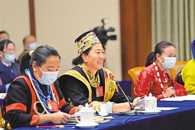 10月17日,西藏代表團舉行分組會議,認真討論黨的二十大報告。 圖為西洛卓瑪代表(中)在會上發(fā)言。 旦增西旦 攝