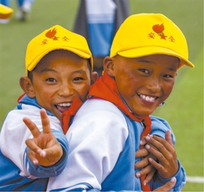 西藏自治區(qū)山南市貢嘎縣森布日小學(xué),孩子們?cè)诓賵?chǎng)上嬉戲。