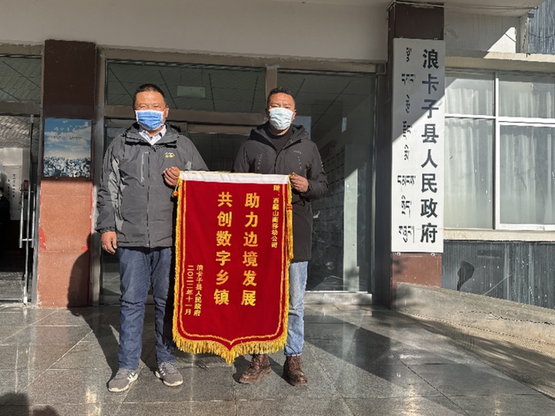 浪卡子縣政府向中國移動山南分公司授予“助力邊境發(fā)展 共創(chuàng)數(shù)字鄉(xiāng)鎮(zhèn)”錦旗。