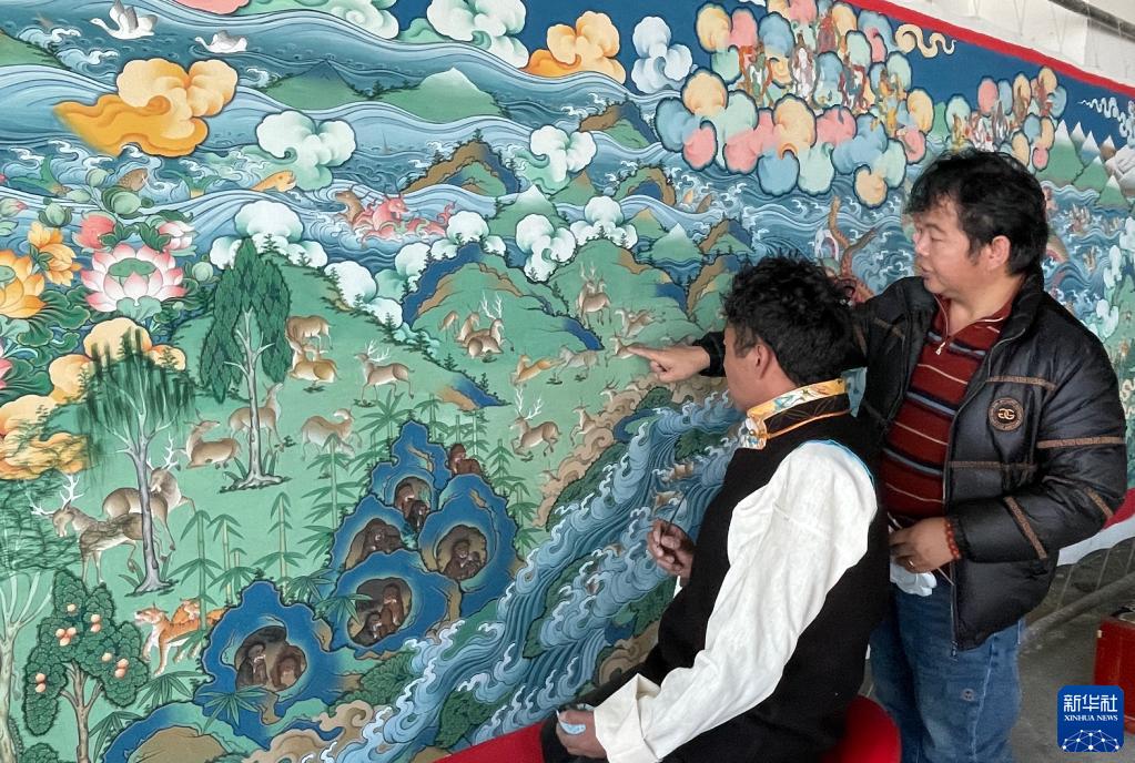 西藏勉薩畫派非遺傳承人西落(右)正在和他的學(xué)生繪制新題材唐卡“百匠唐卡·千米畫卷”(12月19日攝)。新華社發(fā)