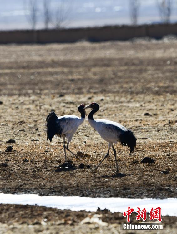 每年的10月底,成群的黑頸鶴飛到西藏拉薩市林周縣越冬,在拉薩市林周縣周邊的湖泊濕地度過5個(gè)月的“閑云野鶴”生活,次年三四月份再飛向藏北草原繁殖。黑頸鶴是世界上唯一一種高原鶴類。具有足長、喙長、頸長的典型涉禽類特征,適合在沼澤地里行走。黑頸鶴的頸、尾為黑色,體羽為灰白色。黑頸鶴是國家一級保護(hù)動物。目前,每年到林周縣越冬的黑頸鶴已達(dá)2000只左右。圖為黑頸鶴在林周境內(nèi)的農(nóng)田里覓食、嬉戲。 貢嘎來松 攝