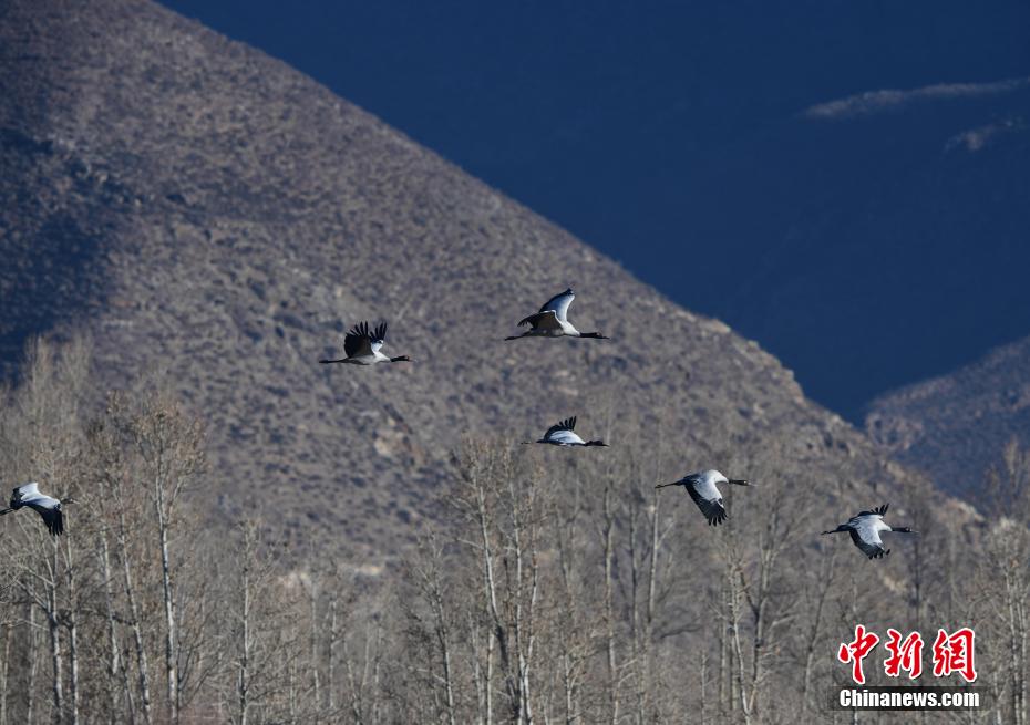 每年的10月底,成群的黑頸鶴飛到西藏拉薩市林周縣越冬,在拉薩市林周縣周邊的湖泊濕地度過5個(gè)月的“閑云野鶴”生活,次年三四月份再飛向藏北草原繁殖。黑頸鶴是世界上唯一一種高原鶴類。具有足長、喙長、頸長的典型涉禽類特征,適合在沼澤地里行走。黑頸鶴的頸、尾為黑色,體羽為灰白色。黑頸鶴是國家一級保護(hù)動物。目前,每年到林周縣越冬的黑頸鶴已達(dá)2000只左右。圖為黑頸鶴在林周境內(nèi)的農(nóng)田上空飛翔。 貢嘎來松 攝