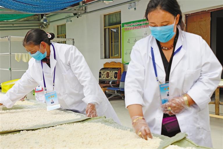 圖為聶榮縣色慶鄉(xiāng)雜瑪多種經(jīng)營(yíng)合作社工作人員對(duì)奶渣進(jìn)行干燥處理。 記者 萬(wàn)靖 謝偉 攝