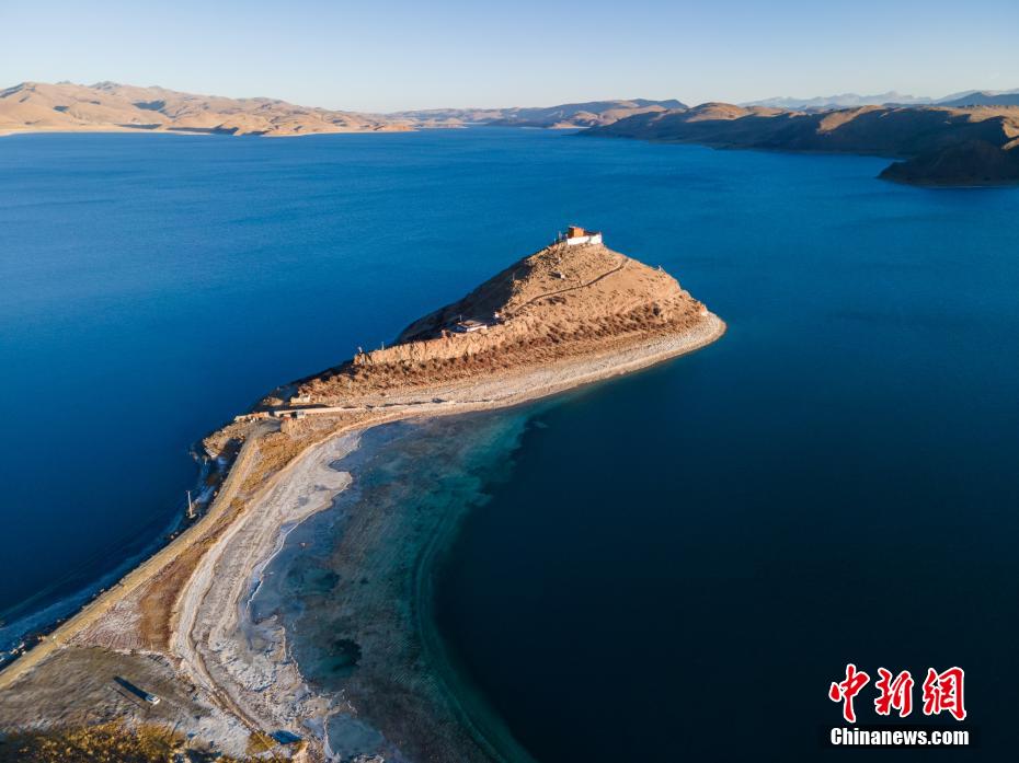 近日,西藏自治區(qū)山南市羊卓雍錯(cuò)(簡(jiǎn)稱羊湖),冬日由于沒(méi)有云層遮擋,湖水更顯深藍(lán)、孔雀藍(lán)。航拍視角下,湖水像巨大的寶石鑲嵌于高原大地,風(fēng)光壯麗。羊卓雍錯(cuò)藏語(yǔ)意為“碧玉湖”,湖面海拔4441米,與納木錯(cuò)、瑪旁雍錯(cuò)并稱西藏三大“圣湖”。圖為羊湖著名景點(diǎn)日托寺。 江飛波 攝