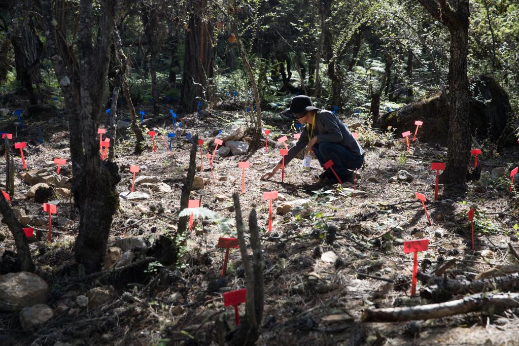 在波密縣扎木鎮(zhèn)東若村林地,工作人員在查看林下?lián)嵊牟靥炻槌砷L(zhǎng)情況。新華社記者 金立旺 攝