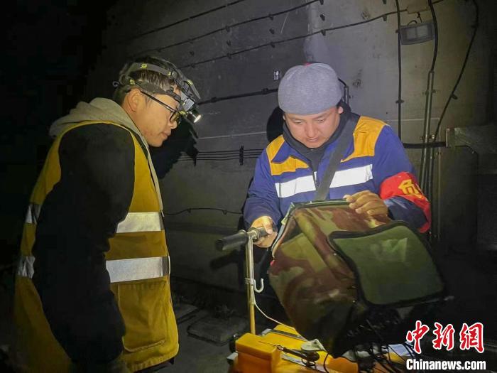 次旦平措(右)與同事深夜在拉林鐵路進(jìn)行鋼軌探傷作業(yè)?!●R生明 攝