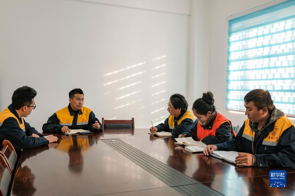 羅布(左二)在班前會上給鋼軌探傷隊(duì)員進(jìn)行任務(wù)部署和安全警示(1月12日攝)。新華社記者 孫非 攝