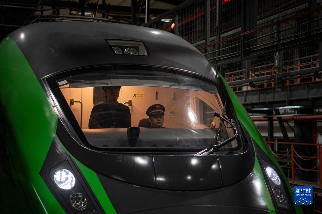 在拉薩機輛整備中心,黃起崗將動車組駛?cè)胪\囄恢茫?月11日攝)。新華社記者 孫非 攝