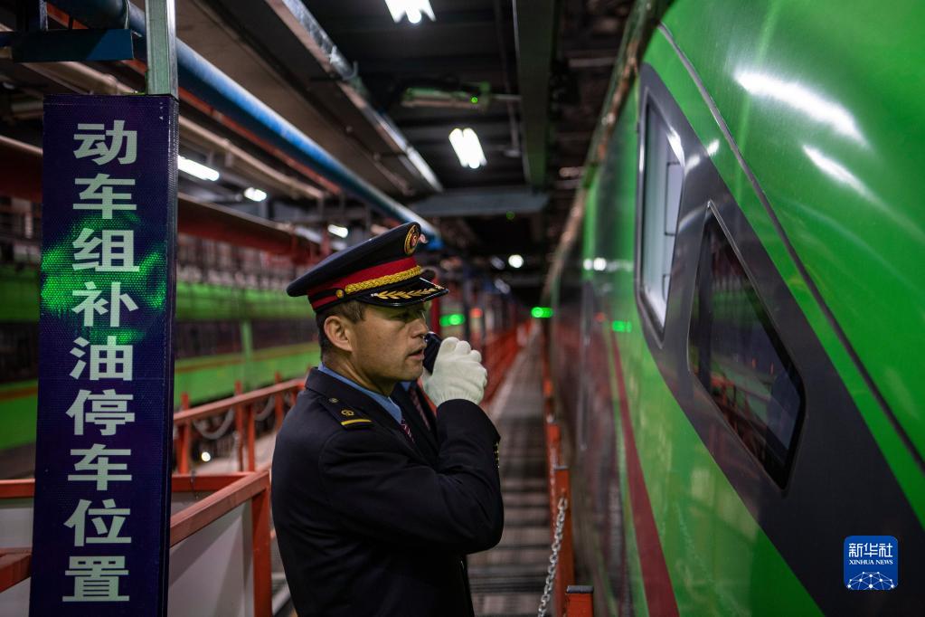 在拉薩機輛整備中心,黃起崗在和一體化調(diào)度中心確認動車組補油位置(1月11日攝)。新華社記者 孫非 攝