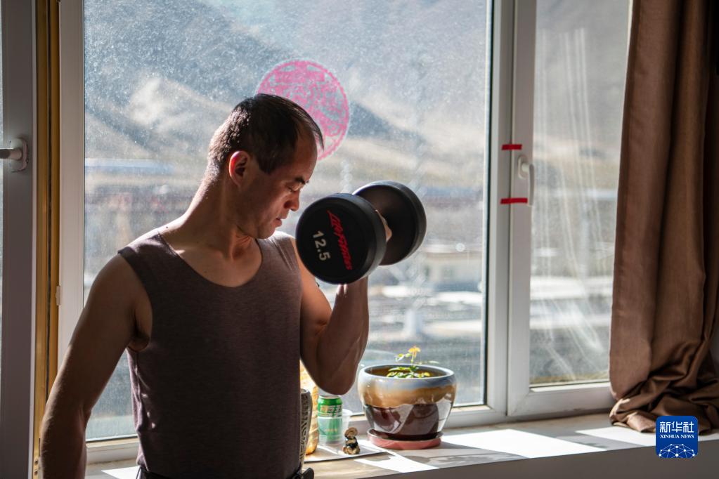 在拉薩機輛整備中心的宿舍里,黃起崗利用空閑時間鍛煉身體(1月11日攝)。新華社記者 孫非 攝