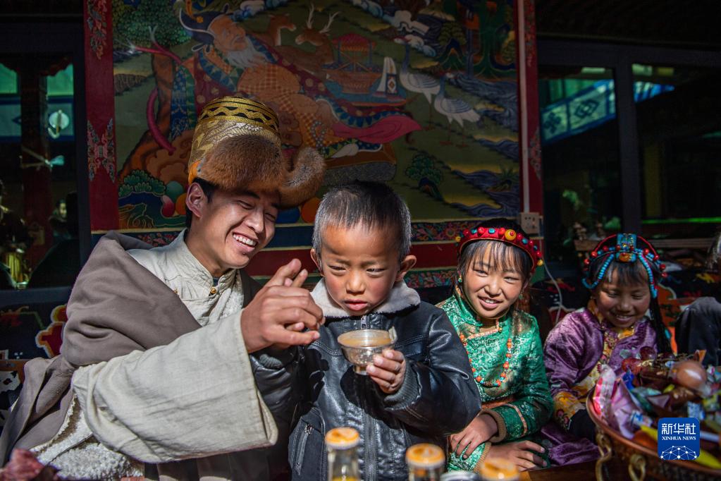 次旦老人的孫子在喝青稞酒(1月22日攝)。新華社記者 晉美多吉 攝
