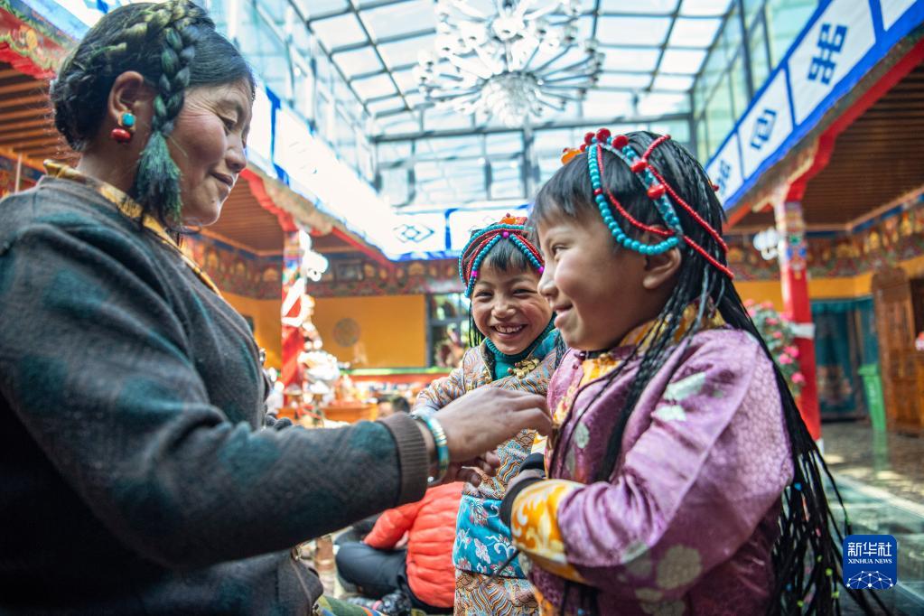 今年,日喀則藏歷農(nóng)家年和春節(jié)“巧遇”同一天,雖習(xí)俗不同,但年味皆濃。次旦的兒孫早早開車去縣城采買了年貨,兒媳婦們?cè)诩覝?zhǔn)備過年吃的羊頭、切瑪?shù)葌鹘y(tǒng)特色美食。家中的第四代,次旦老人的重孫子和重孫女們,則穿上了漂亮的藏裝,頭戴綠松石點(diǎn)綴的頭飾,在家中歡快地跑來跑去。