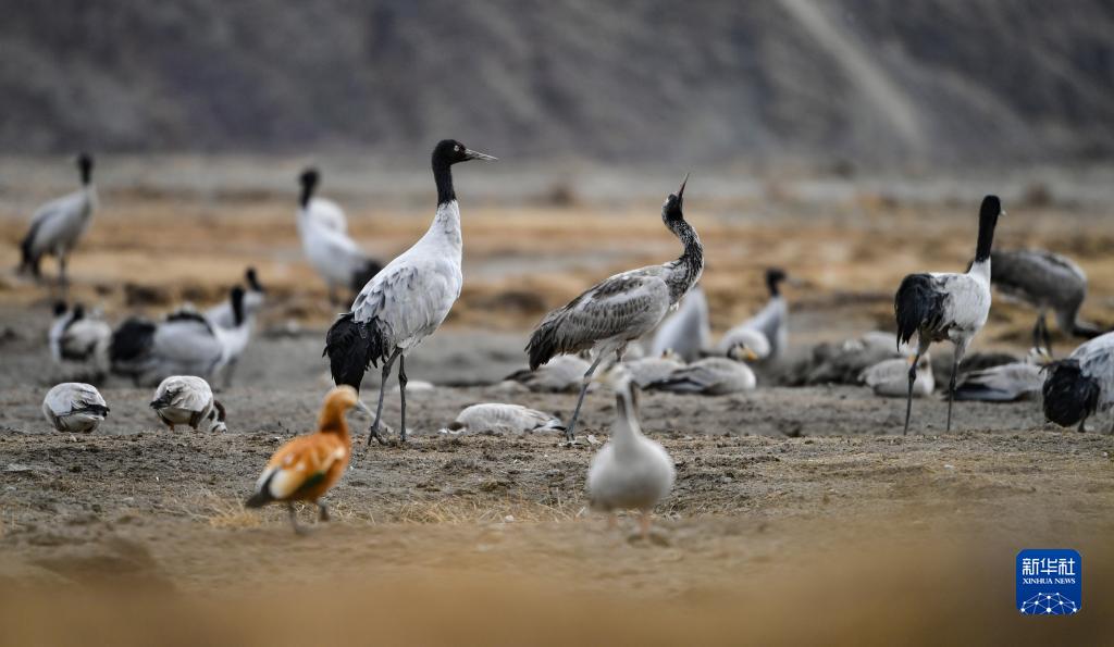 在西藏雅魯藏布江中游河谷黑頸鶴國家級(jí)自然保護(hù)區(qū)日喀則片區(qū)拉孜縣附近,大量越冬的黑頸鶴翩翩起舞,迎接春天的到來。