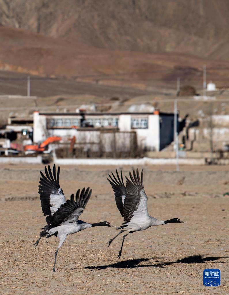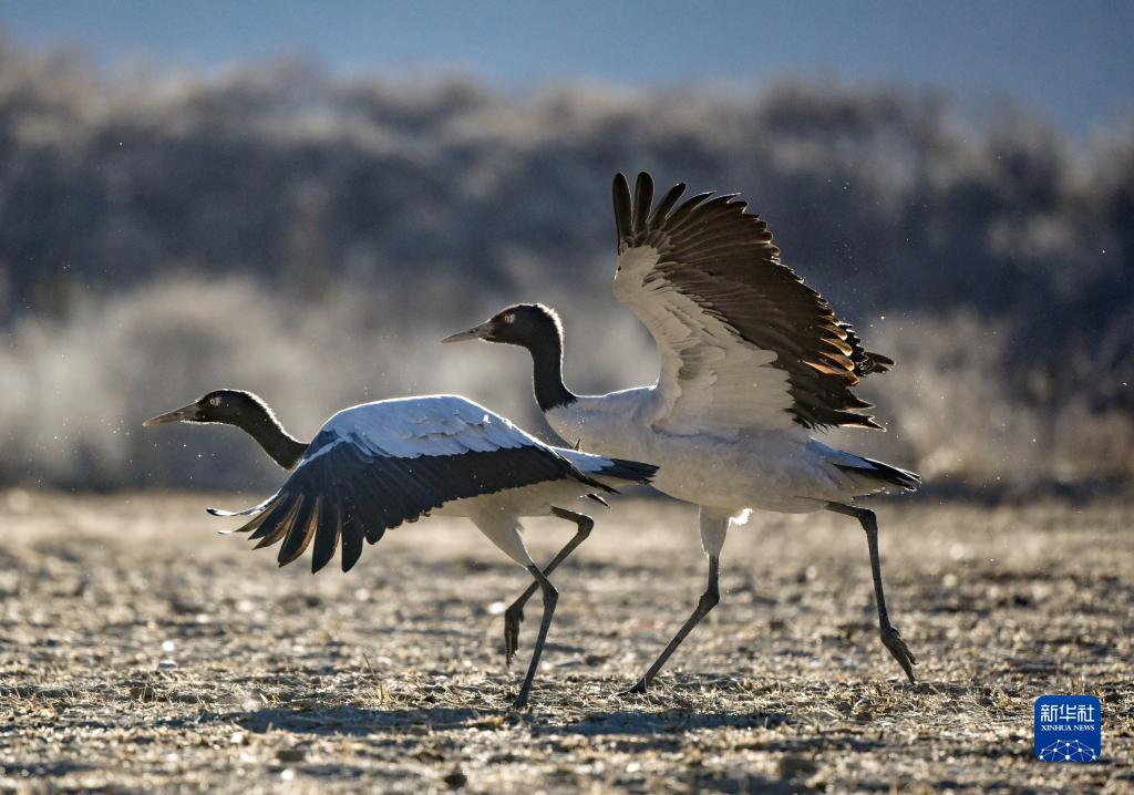 在西藏雅魯藏布江中游河谷黑頸鶴國家級(jí)自然保護(hù)區(qū)日喀則市拉孜縣越冬的黑頸鶴(1月23日攝)。新華社記者 孫非 攝
