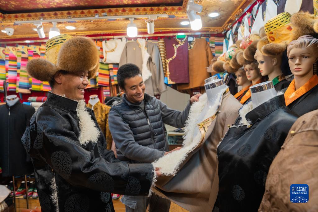 在八廓街周邊的老城區(qū),顧客在挑選藏裝(1月11日攝)。新華社記者周荻瀟 攝