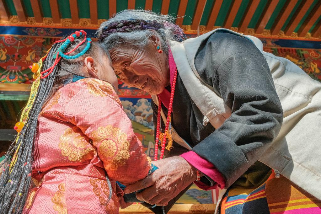 今年,西藏農(nóng)家年和春節(jié)“巧遇”同一天,習(xí)俗雖不同,但年味皆濃。從縣城買(mǎi)來(lái)的年貨,一家人制作的切瑪和卡塞(油炸面食)等傳統(tǒng)供品和食品,紛紛擺上了桌。第四代的孩子們,也換上了嶄新的藏裝,頭戴綠松石點(diǎn)綴的頭飾,依偎在祖奶奶次旦的身旁。