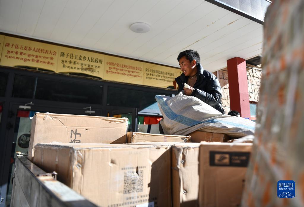 玉麥鄉(xiāng)郵遞員在搬運剛剛抵達玉麥的快遞包裹(2023年1月8日攝)。新華社記者 晉美多吉 攝