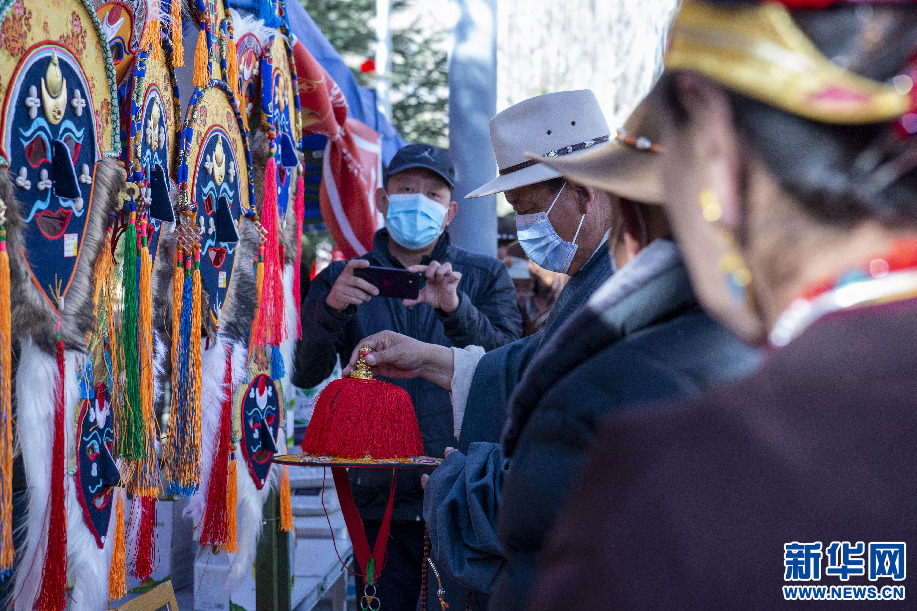 2月14日,群眾在阿古傳統(tǒng)藏戲服飾農(nóng)牧民專業(yè)合作社展位上挑選傳統(tǒng)藏戲服飾。新華網(wǎng) 旦增努布 攝