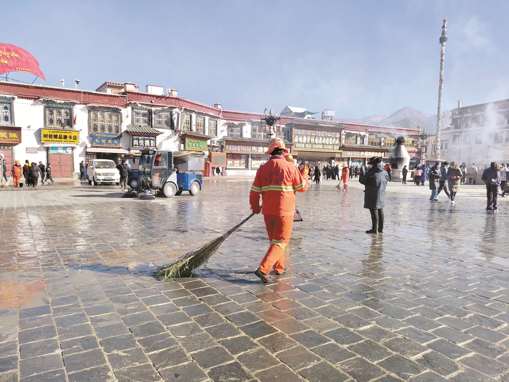 圖為博瑞環(huán)衛(wèi)服務(wù)有限公司環(huán)衛(wèi)工人對大昭寺廣場進(jìn)行清掃、沖洗。 拉薩融媒記者 李從芳攝