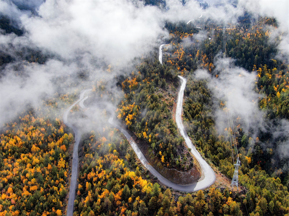 2020年11月5日拍攝的派墨公路米林段一景(無人機(jī)照片)。新華社發(fā)(董志雄 攝)