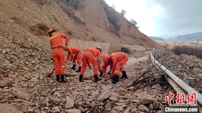 圖為昌都市卡若區(qū)森林消防中隊“火焰藍”志愿服務隊清理滑坡路段。 昌都市卡若區(qū)森林消防中隊供圖