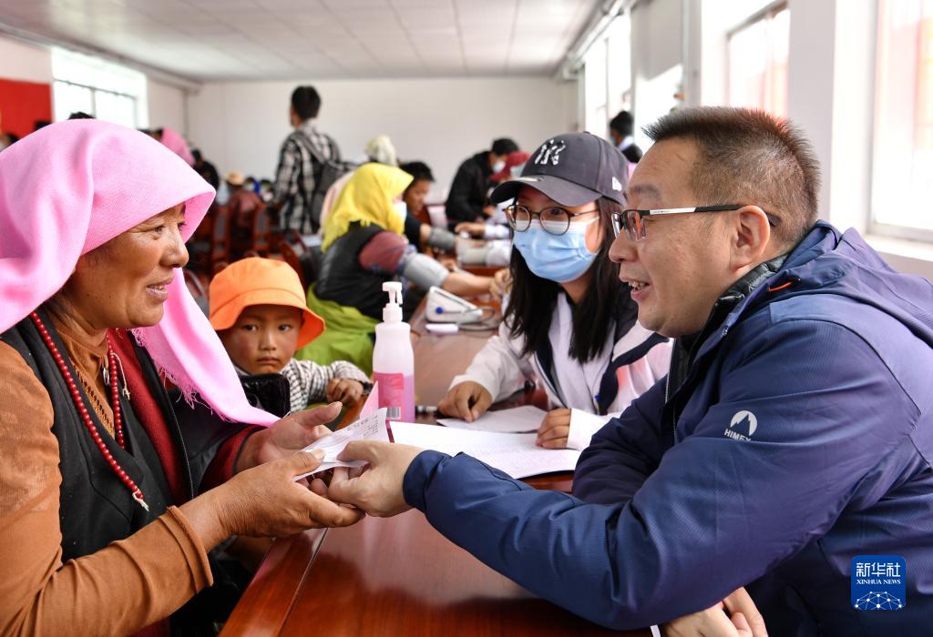 北京市第七批“組團(tuán)式”援藏醫(yī)療隊專家、拉薩市人民醫(yī)院副院長汪紅兵(右)為居民義診(2022年6月9日攝)。新華社記者 張汝鋒 攝